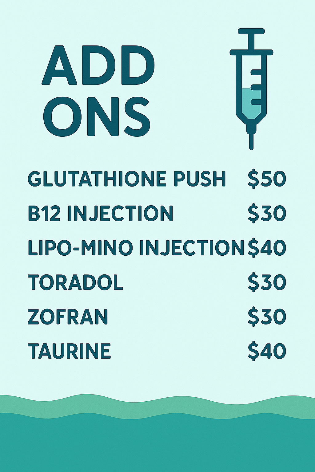 Customize your drip with targeted add-ons designed to maximize your results. Whether you’re looking for more energy, pain relief, immune support or an extra glow, our injections and pushes give you the flexibility to tailor your infusion to your exact needs.