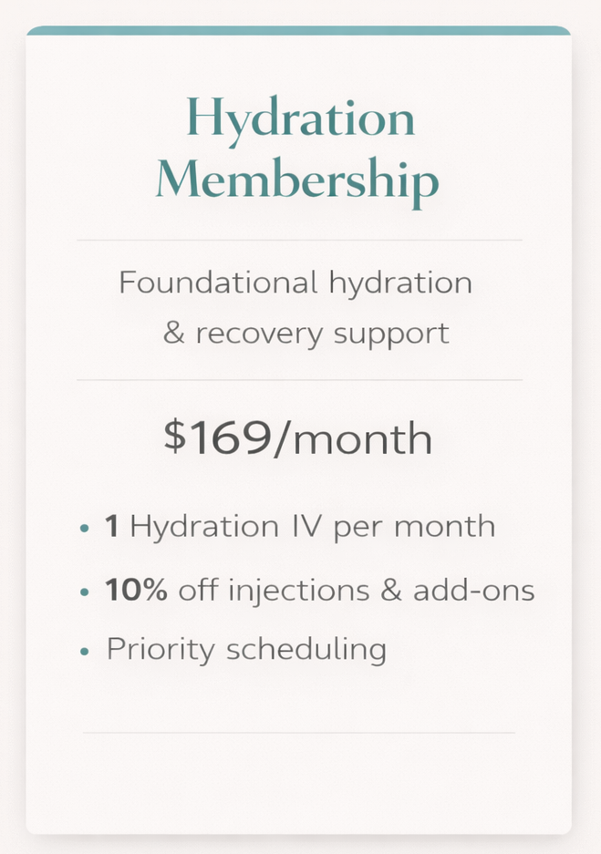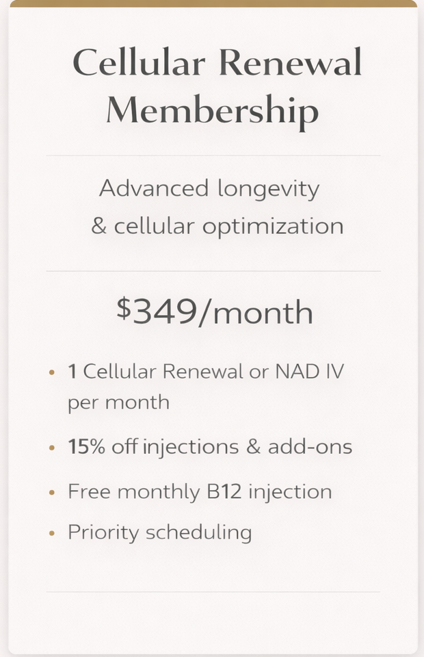 Created for those committed to healthy aging and proactive wellness. This monthly infusion delivers NAD-focused cellular support to help improve energy, enhance recovery, and support long-term vitality.